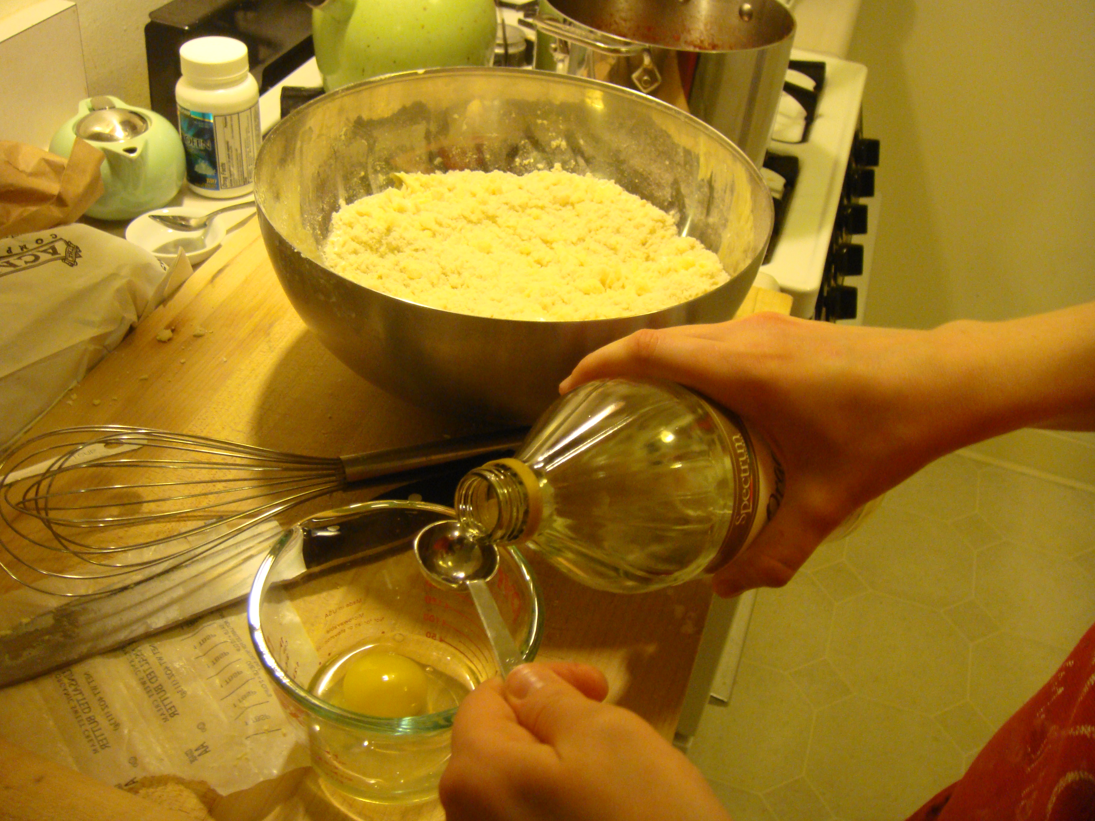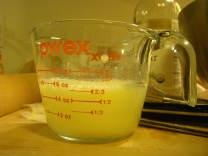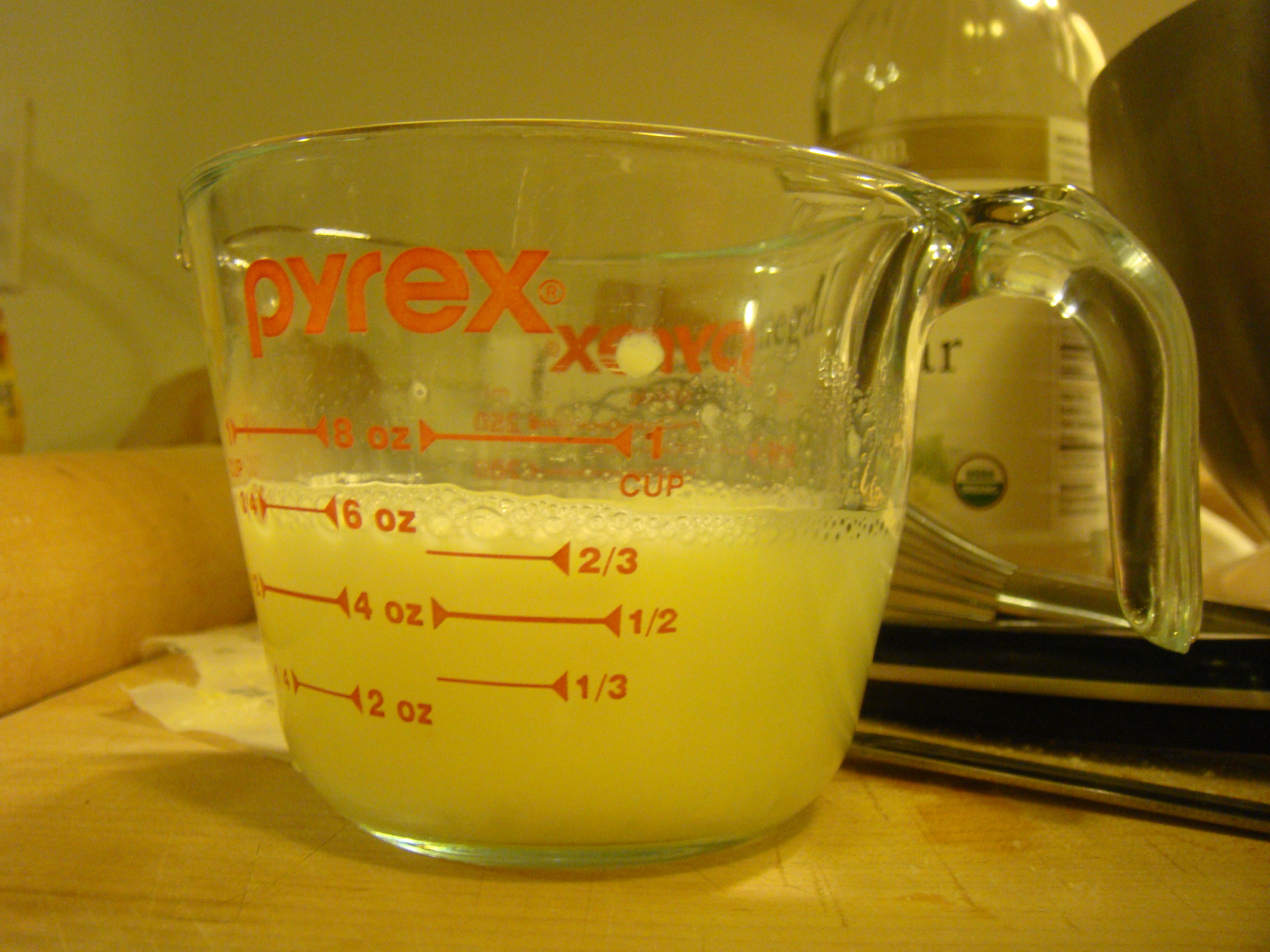 Combine egg and vinegar in measuring cup. Whisk with fork. Add enough ice water to make 2/3 cup. The bubbles make it look like it’s over 2/3 cup in the picture below, but it was fine.