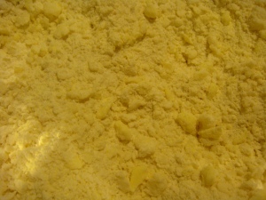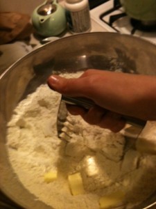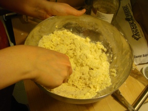 Cut lard and butter into chunks and add them to the flour mixture. Cut them into the flour mixture with a pastry blender. The mixture should resemble coarse crumbs, with some pea size chunks. Don’t make it too fine. The large chunks are the secret to flaky pastry.