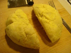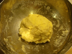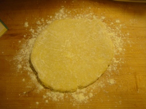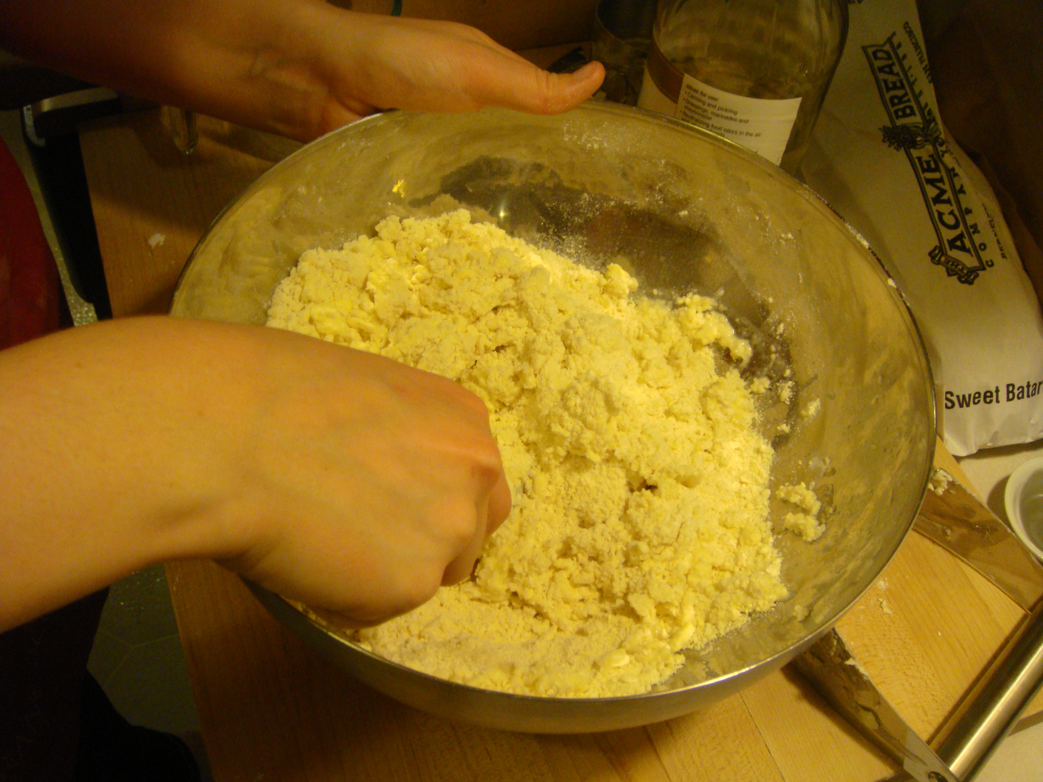 Toss together with a fork until you have a ragged dough. Don’t over mix. Form into ball.