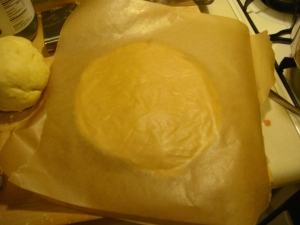 Wrap each half in parchment paper or wax paper. To save paper, I put the first disk of pastry between two sheets of paper. Then I set the other disk on top and put one more sheet on top. I also wrap up any remnants in the same paper. Chill the pastry for at least half an hour.
