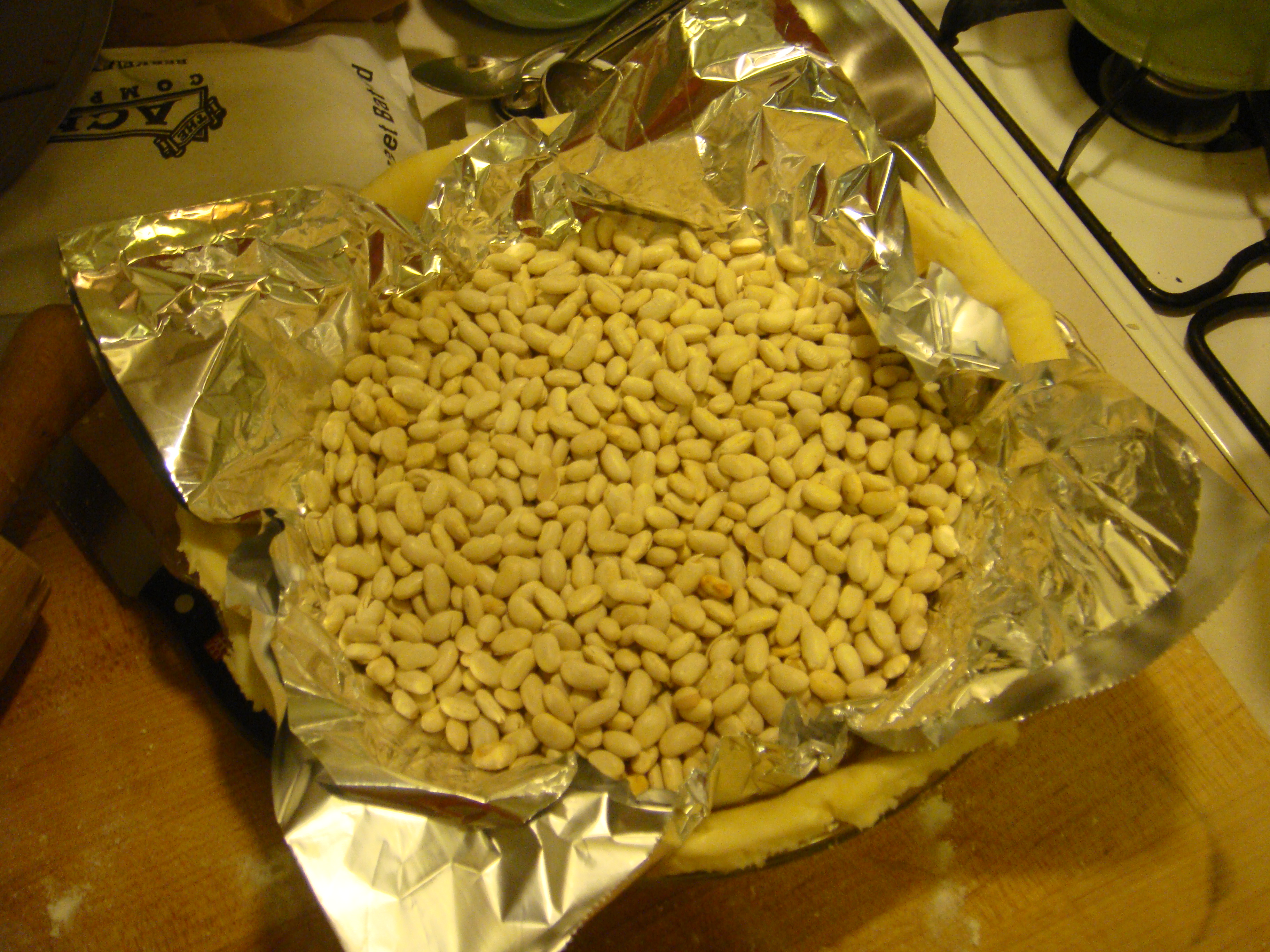 Trim off the excess with a knife. You can save the pastry for other things, like chicken pot pie. (Recipe coming soon.) Take a large piece of foil, fold it in half, and smear it with butter. Place it butter side down in the pie plate. Put some pie weights on top. You can use dried beans for pie weights. I have beans just for this that I keep in a yogurt tub in the pantry labeled “pie weights.”