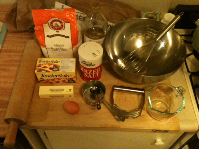 Here are the tools and ingredients I used. You can’t buy Tenderflake lard in the United States. It’s Canadian. My granny sent it to me. Tenderflake lard is like President’s Choice or Tim Hortons. You wish it was here, but it isn’t. You can get other lard here though.