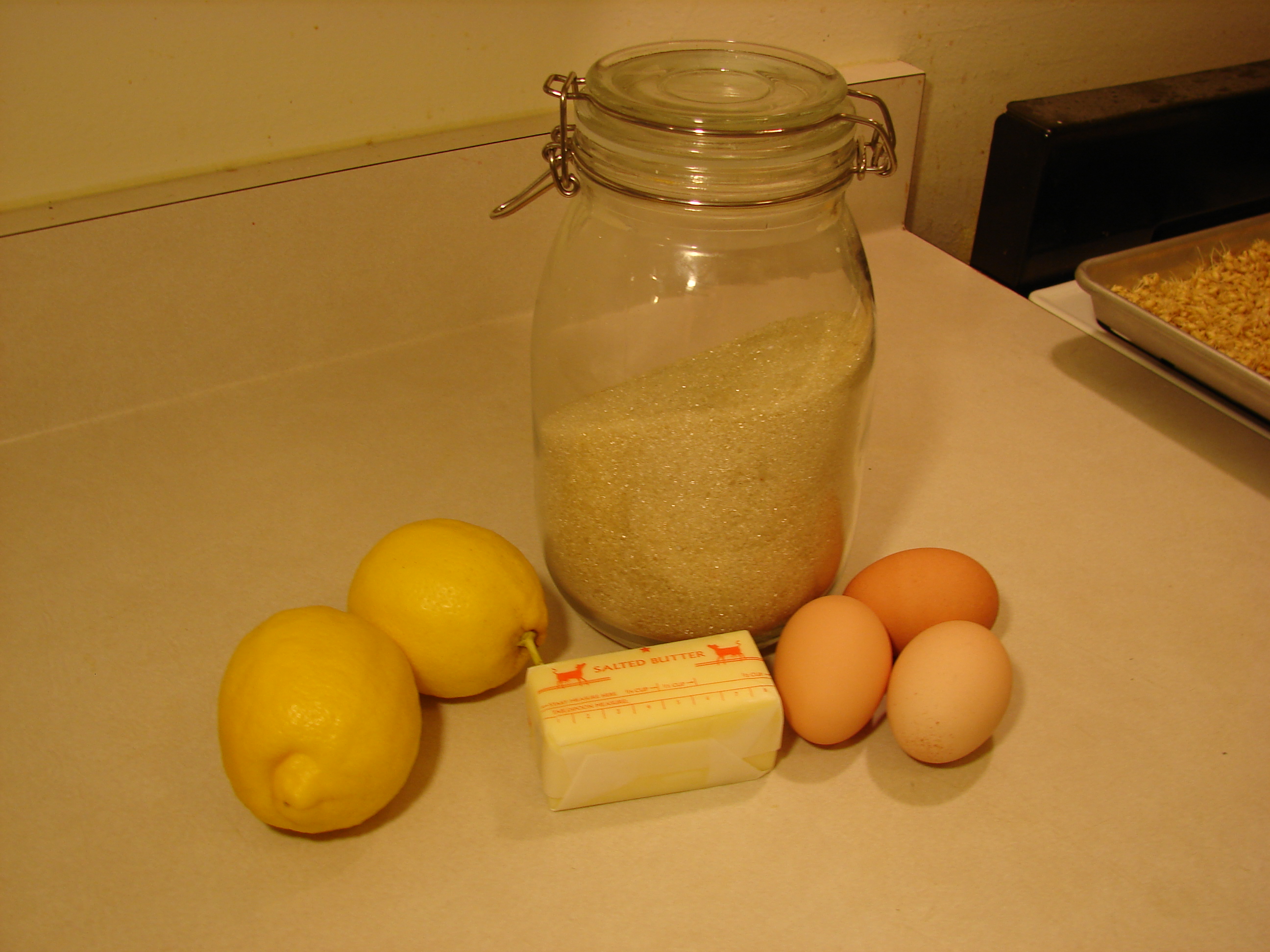 I just picked these lemons from my lemon tree. I have tons of lemons now, so I decided to make some lemon curd. Lemon curd only takes about ten minutes to make. Its cheaper than store-bought lemon curd too. Here are the ingredients you need to make it: